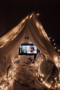 Una forma también muy original de crear un cine en casa que les encanta e ilusiona mucho a los más pequeños, es montar una tienda de campaña o tipi. Si no tienes ninguna puedes hacerla con telas, listones, colchonetas, sábanas, mantas y cojines.