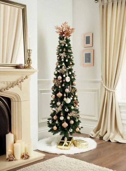 Árbol de Navidad Realista estrecho Slim ideal para la decoración Navideña de cualquier rincón pequeño. Este árbol de Navidad es estilo lápiz de 2,10m alto x 0,80cm de ancho.