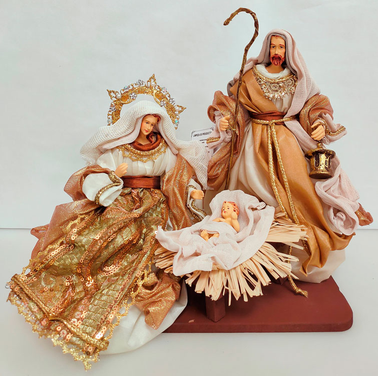 Este Belén Navidad original de tamaño real está compuesto por un conjunto de 3 figuras: San José, María y el Niño Jesús. Su tamaño es de 25cm. Los tonos de este nacimiento son en Dorado y Blanco.