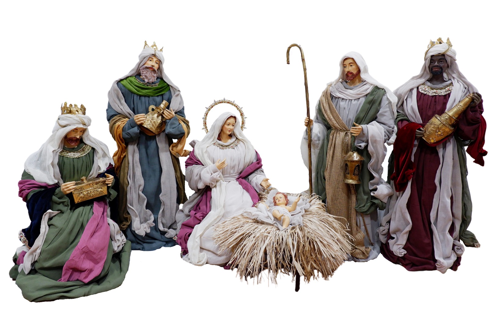 Este Belén Navidad original de tamaño real, está compuesto por un conjunto de 6 figuras belén grandes: San José, María, el Niño Jesús, Melchor, Gaspar y Baltasar. Su tamaño es de 1M. Los tonos de este nacimiento son en Rosa, Dorado, Verde, Azul, Rojo, y Blanco.