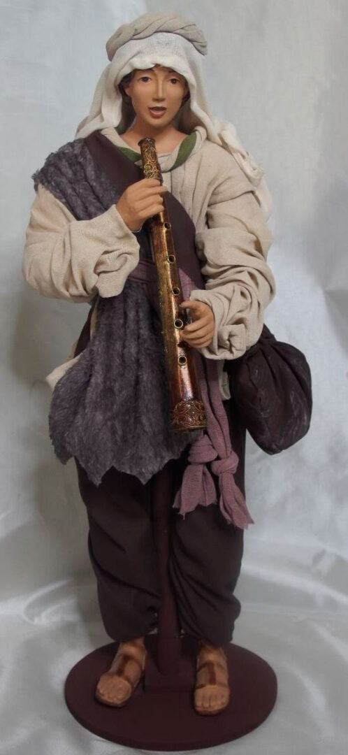 Este Pastor para el Belén Navidad original de tamaño real está compuesto por 1 figura de pastor de pie con flauta. Su tamaño es de 68cm. Los tonos son en Morados y Blanco.