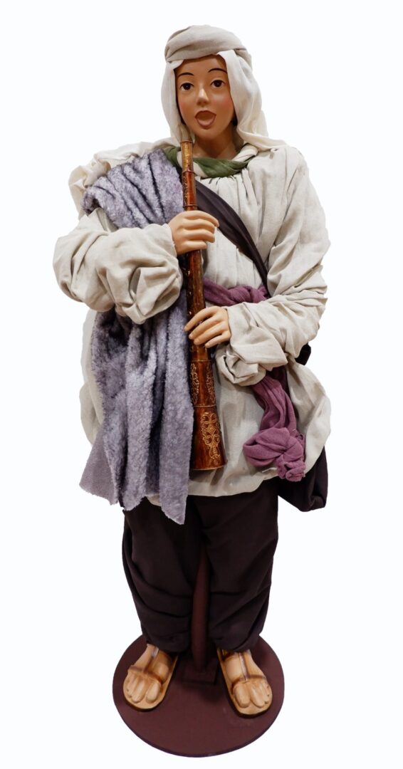 Este Pastor para el Belén Navidad original de tamaño real está compuesto por 1 figura de pastor de pie con flauta. Su tamaño es de 68cm. Los tonos son en Morados y Blanco.