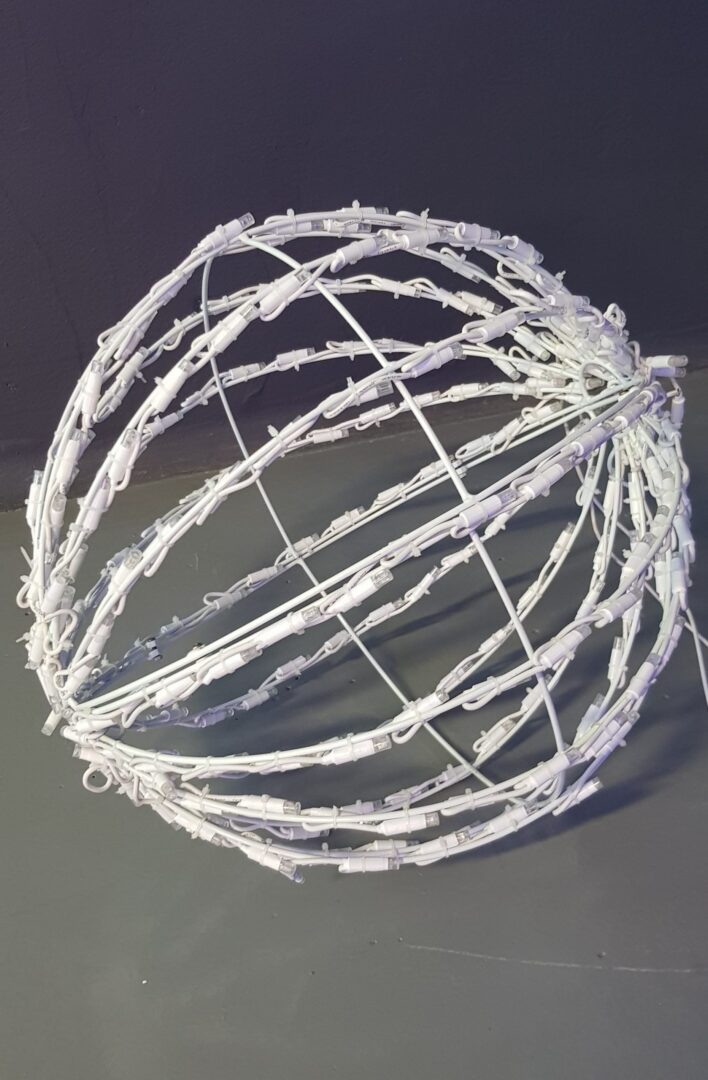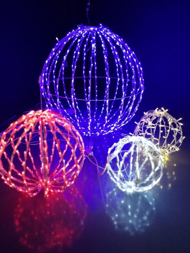 La bola led 3D luz , son esferas de estructura metálica recubiertas por guirnaldas de luces led con destello. Disponible en varias dimensiones 30cm, 45cm, 50cm y 80cm y tonalidades blanco frío, blanco cálido, rojo y azul.