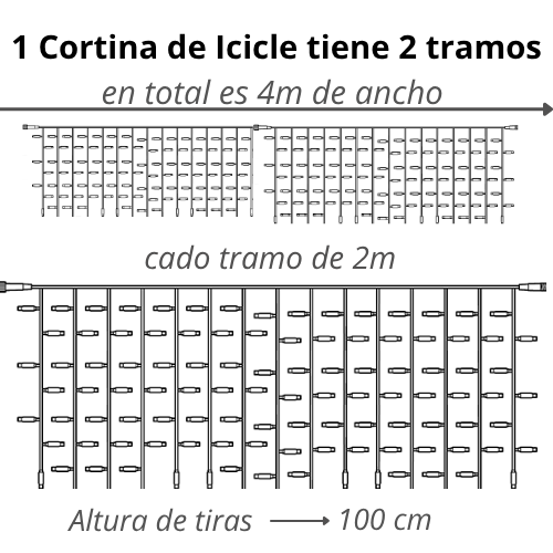 Disponible en tres tonalidades LED: blanco cálido, blanco frío o azul, esta cortina icicle incluye alimentación y se puede enlazar hasta 7 unidades (28 m) con un solo cable de corriente. Su protección IP65 garantiza un funcionamiento seguro y duradero incluso en condiciones de lluvia o humedad, ideal para fachadas, terrazas, jardines o calles comerciales.