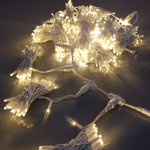 Cortina LED cálido, 2m de ancho, disponible en alturas 1, 2, 4 y 7m – maxiLED, cable blanco, enlazable. Alimentador no incluido