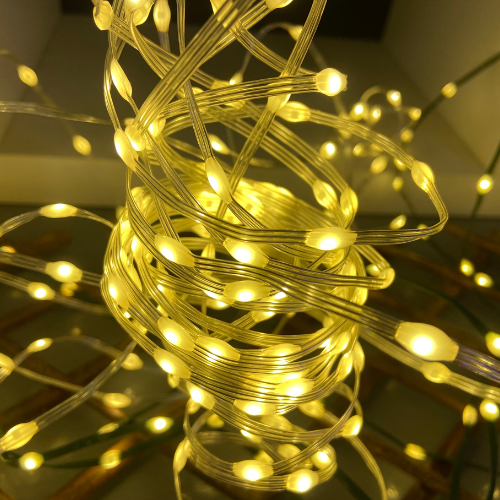 Guirnalda led alambre con microLEDs cálidos y cápsula opal suave, ideal para decorar jardines, terrazas, flores, techos y eventos especiales. Disponible en longitudes desde 14 hasta 30 metros, esta guirnalda se adapta a múltiples espacios y ambientes decorativos.